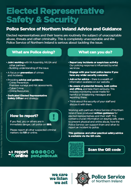 NILGA is working in partnership with the Police Service of Northern Ireland and key stakeholders to help ensure the safety and security of elected representatives and their staff.